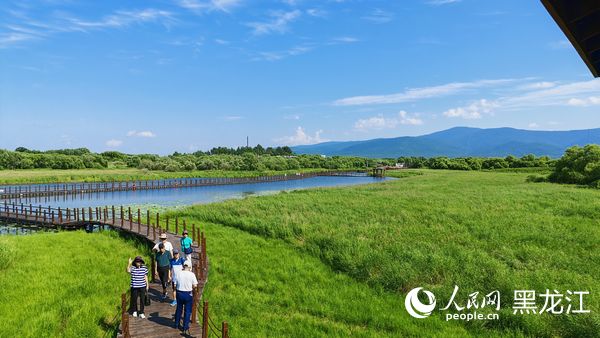 在黑瞎子岛湿地公园,河流纵横交错,两侧草木葳蕤……漫步在栈道,仿佛置身于一幅天然的画卷中。偶有鸟儿从头顶飞过,鸟鸣声为静谧的边境生态画卷增添了勃勃生机。